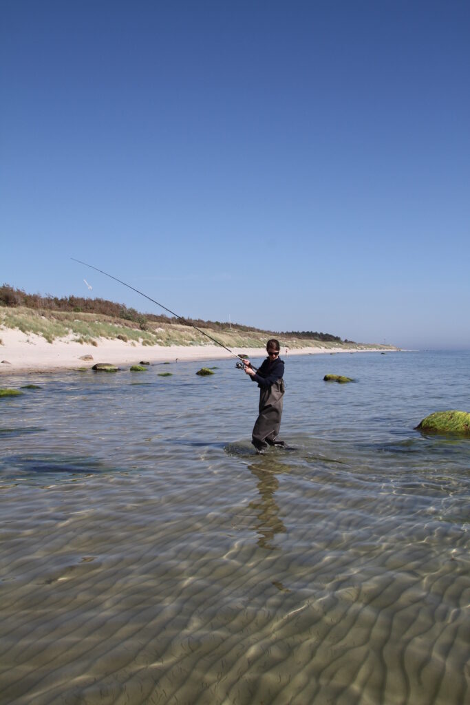Wenn du magst, lernst du das Angeln auf Meerforellen – stehst in der Wathose draußen im Meer, spürst Wind und Wasser, und vielleicht gelingt dir der Fang eines dieser wilden Fische.